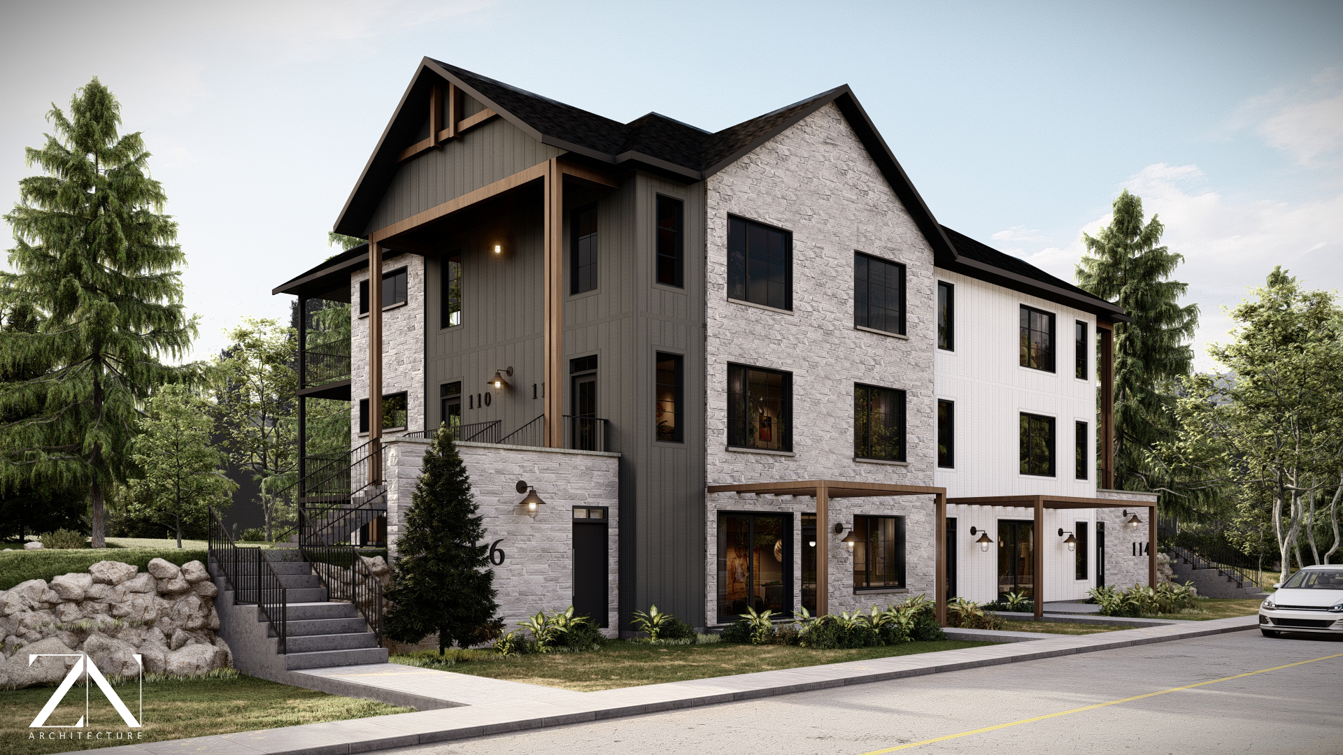 Ce projet résidentiel s’inspire du style farmhouse contemporain, réinterprété avec une élégance sobre et actuelle. Niché dans un environnement verdoyant, le bâtiment propose une volumétrie traditionnelle rehaussée par un jeu de textures et de matériaux qui renforce son ancrage dans le paysage. La combinaison du parement de pierre claire, du bardage vertical en bois foncé et des éléments blancs crée un contraste subtil, équilibré par la chaleur des détails en bois naturel et des encadrements sombres. Les grandes ouvertures favorisent une abondante lumière naturelle à l’intérieur tout en animant les façades. L’entrée principale en hauteur, soulignée par une marquise en bois, ainsi que les porches abrités, accentuent l’identité chaleureuse et accueillante de l’ensemble. Ce projet allie avec finesse esthétique rustique et confort moderne, offrant un cadre de vie à la fois intemporel et fonctionnel.