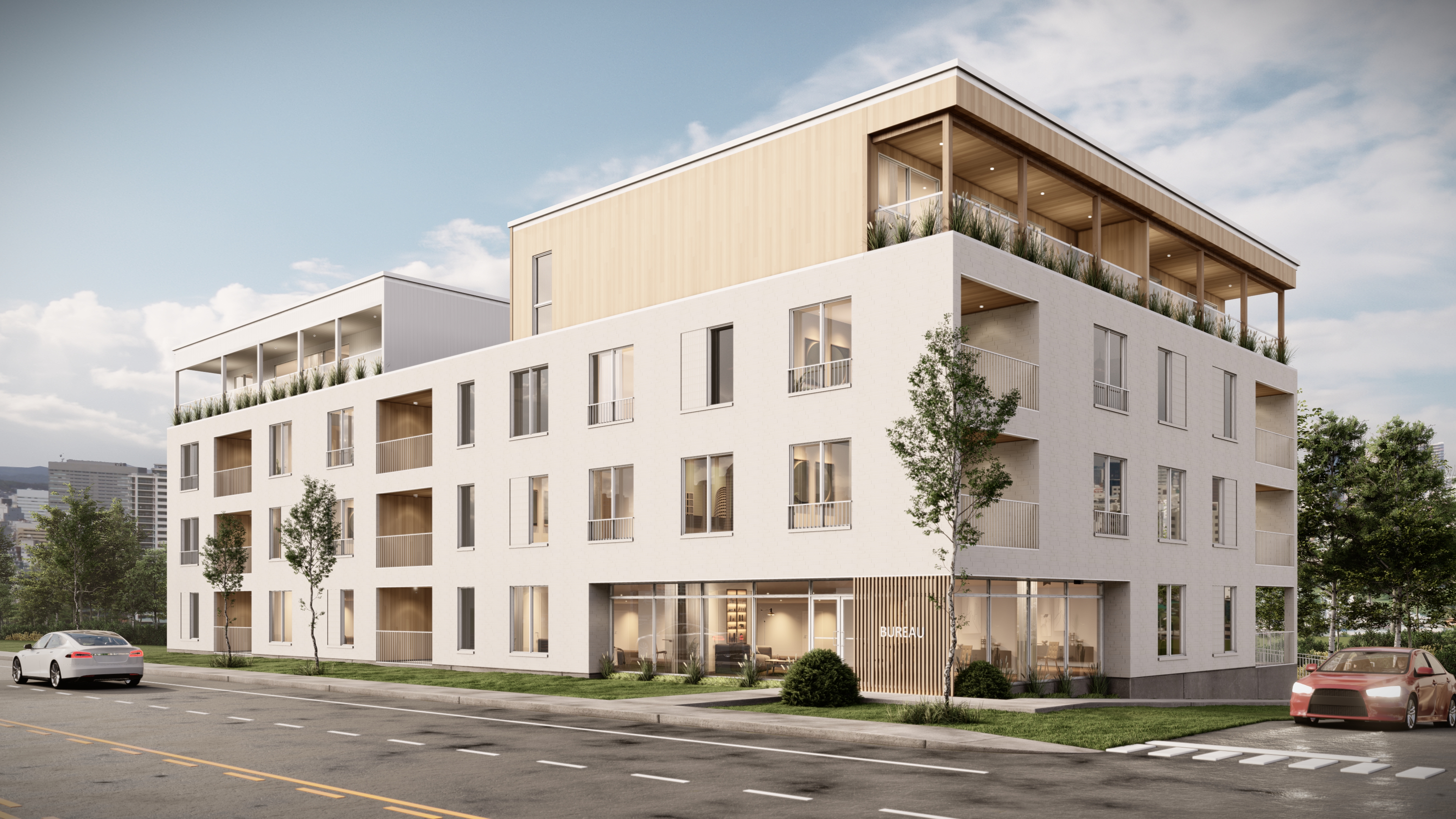 Ce projet à usage mixte s’inscrit dans une volonté de conjuguer harmonieusement vie résidentielle et activités professionnelles au sein d’un même ensemble architectural. La conception réfléchie privilégie une volumétrie simple et équilibrée, où la sobriété des lignes s’allie à une matérialité apaisante et délicate, mettant en valeur la lumière naturelle et l’ouverture sur le quartier. Les façades sont animées par des percées vitrées et des éléments verticaux en bois, tandis que la terrasse en toiture vient enrichir l’expression architecturale d’une élégance contemporaine. L’intégration de bureaux au rez-de-chaussée dynamise la conception visuelle et répond aux besoins d’une mixité fonctionnelle, tout en assurant une transition fluide entre l’espace public et l’espace résidentiel.